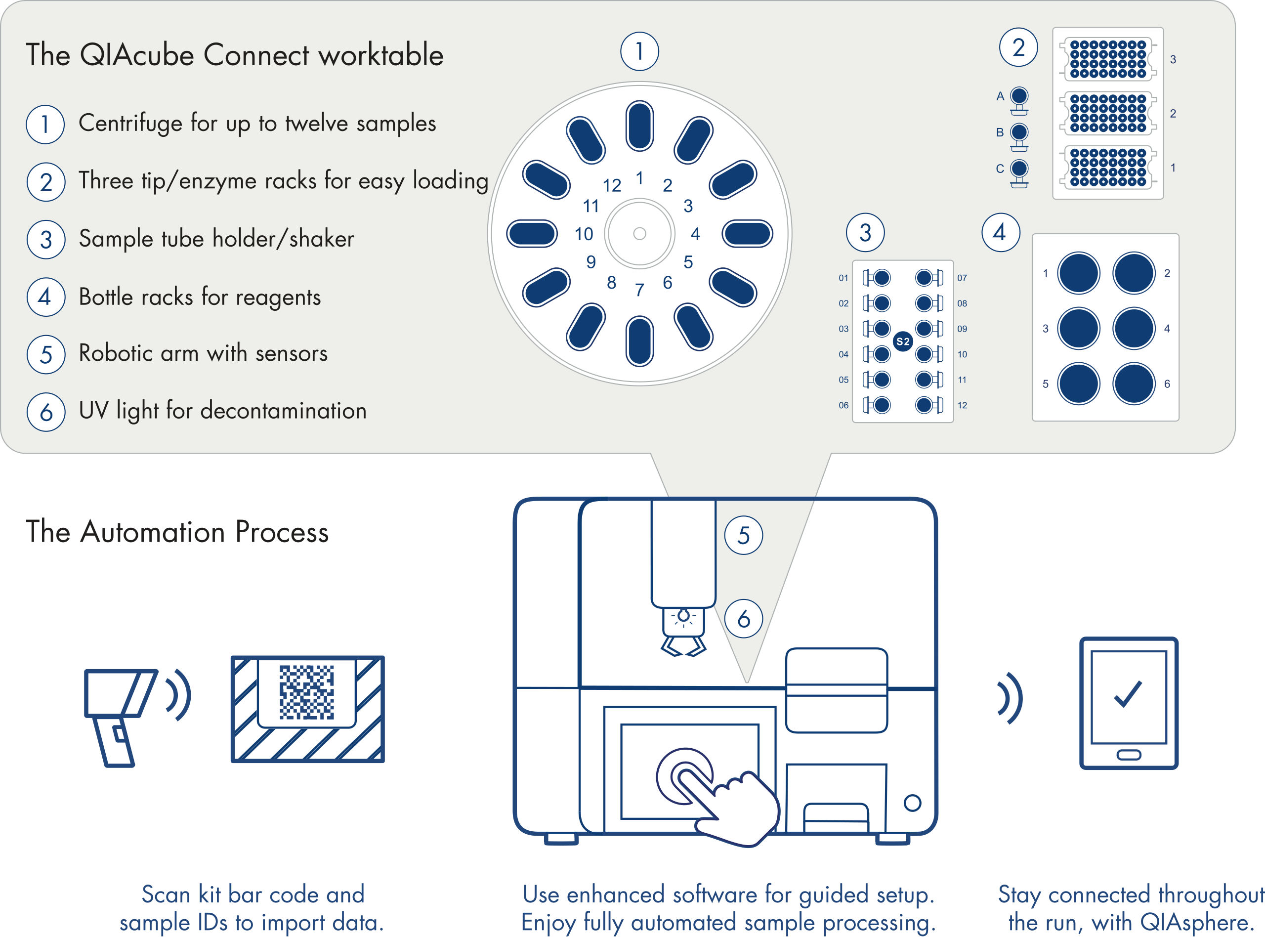 Plug-n-play QIAcube Connect упрощает очистку НК, автоматизируя ручные наборы для спин-колонок QIAGEN (и не только). Не нужно менять химический состав наборов и принцип метода, поэтому запуск происходит быстро, результаты появляются сразу, а производительность сопоставима с ручной процедурой.